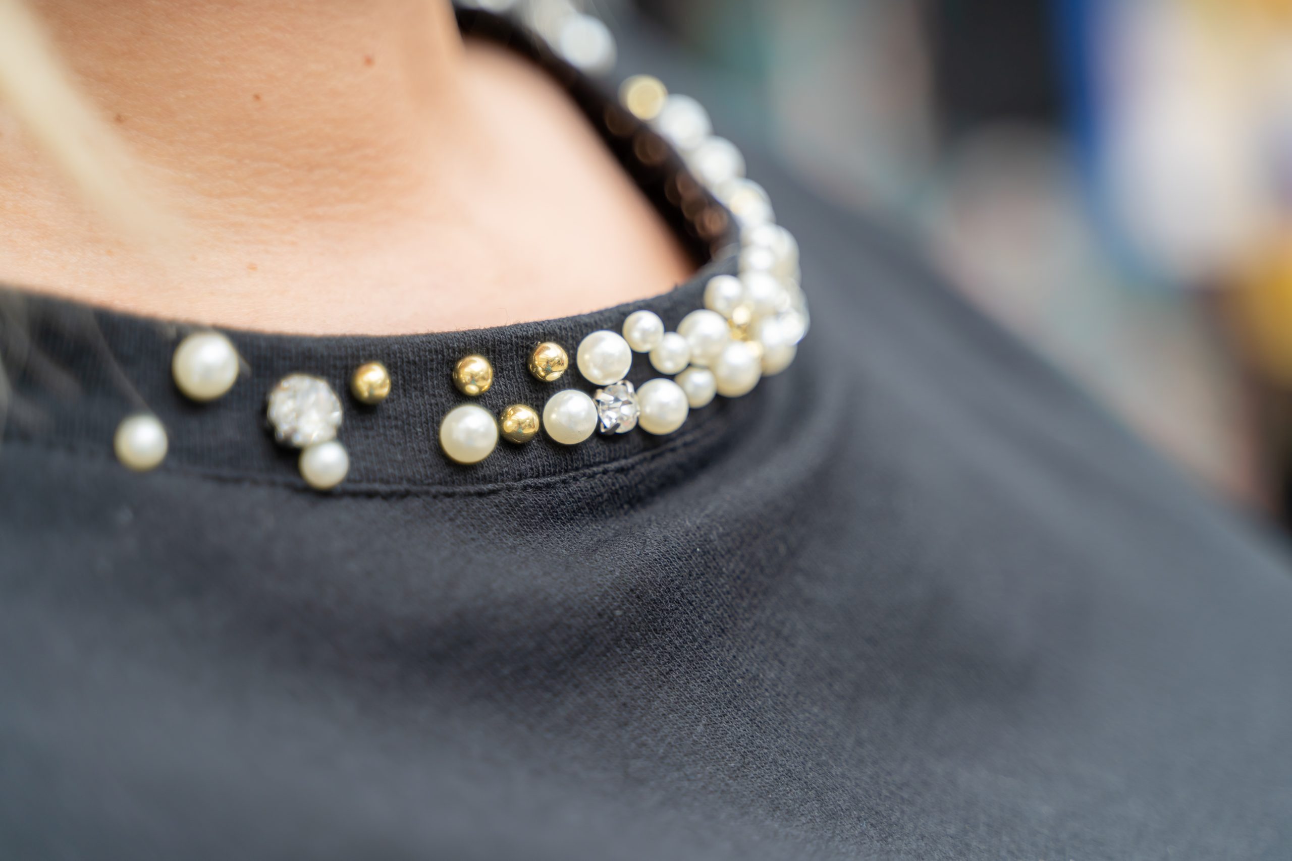 Insertia de perle din zona gatului “bluzei timp liber”,  reusesc sa sustina o aparitie romantica si  rafinata.