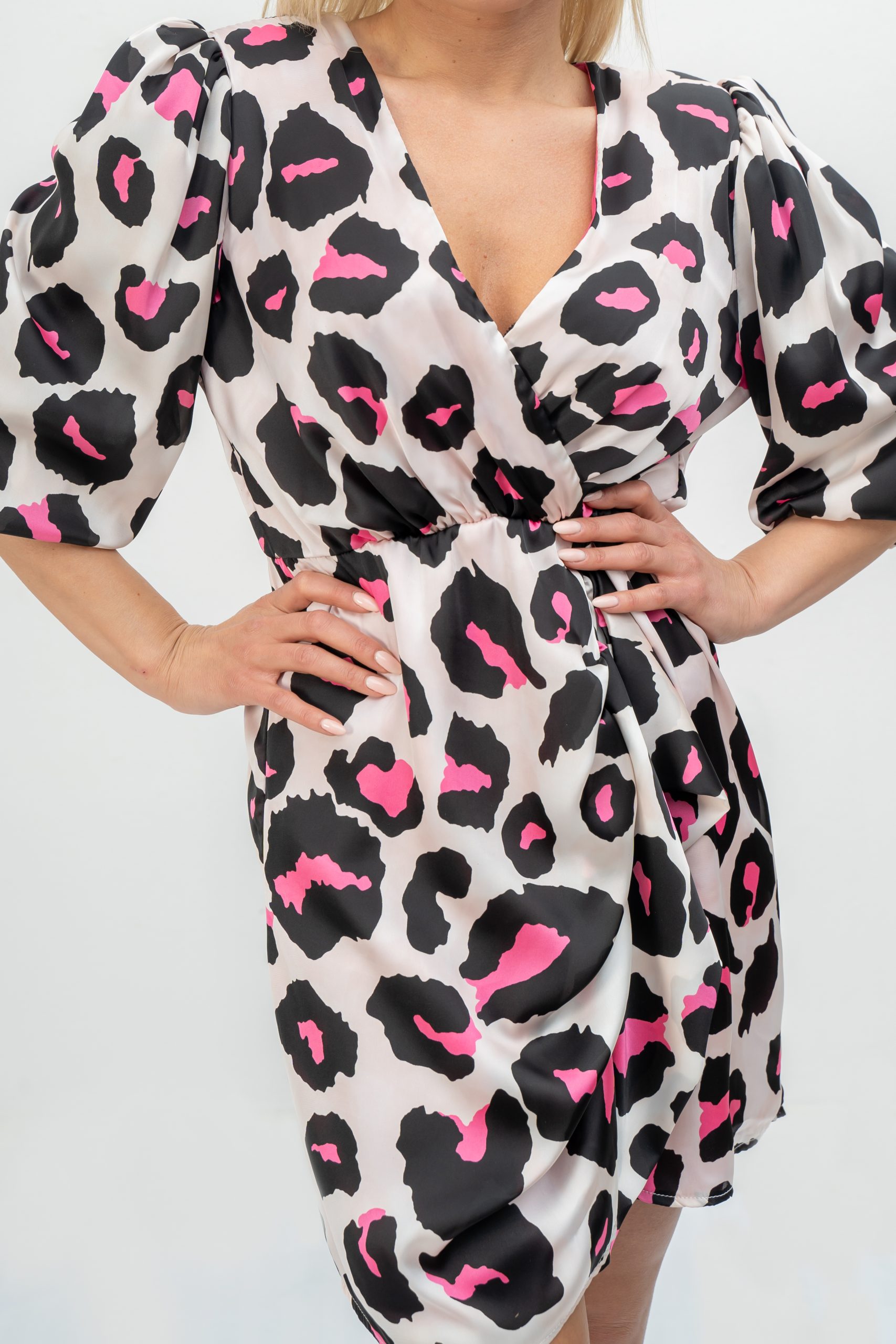 Materialul satinat combinat cu animal print colorat plus design-ul decupat in fata si manecile bufante creeaza se potrivesc perfect pentru un look efervescent si feminin.