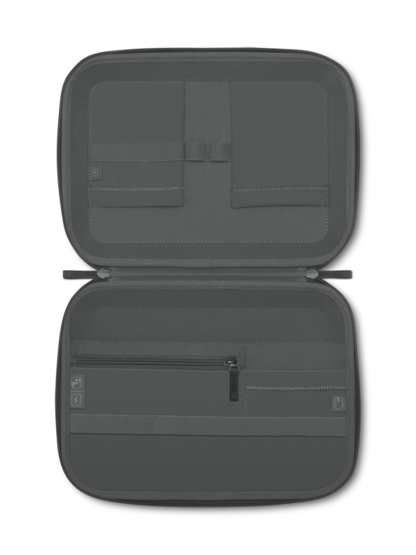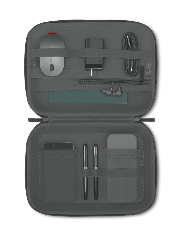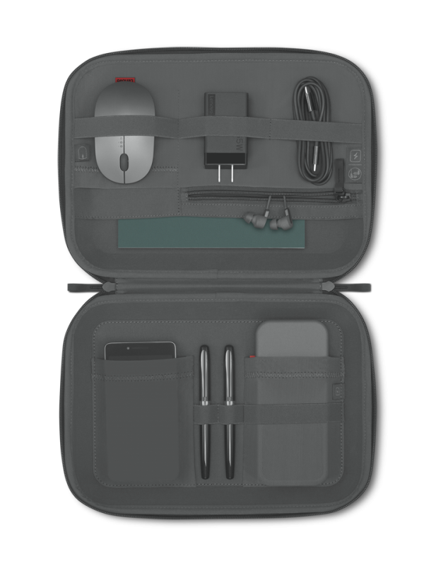 Lenovo Go Tech Accessories Organizer, Portable compact case to easily carry all your key accessories, keep them organized in one place, and keep them protected, Slim enough to fit in your bag and light enough to take on the go, Compression molded construction with hard outer walls to protect your tech devices, Water-repellent zippers are sealed to help prevent liquid entry, Double zippers with easy-grip pullers and 270- degree zip-around opening for full visibility, Soft mesh interior pockets to easily see where all your items are stored, Designed to support your Lenovo Go mouse, in- ear earphones, and powerbank