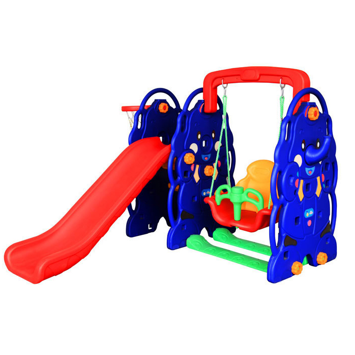 Centrul de joaca include un tobogan, un leagan convertibil, cos baschet